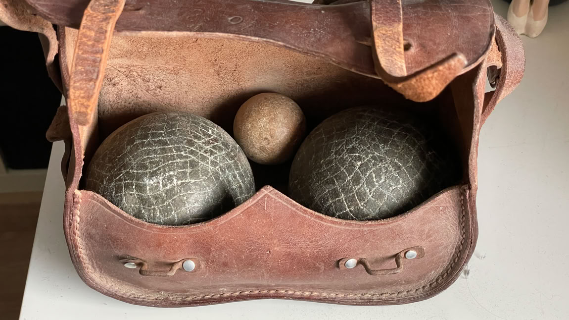 Matériel des débuts de la pétanque. La boule pèse 1’000 g, le cochonnet a un diamètre de 40 mm…